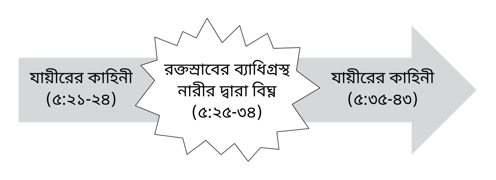 মার্ক ৫:২১-৪৩ পড়ুন। এটি হল একটি কাহিনী যেখানে দুটি অলৌকিক কাজ আছে। রক্তস্রাবের ব্যাধিগ্রস্থ নারীর কাহিনীটি যায়ীর এবং মেয়ের কাহিনীটিকে বাধাগ্রস্থ করেছে। এই দুটি কাহিনীর মধ্যে তুলনা এবং বৈপরীত্যগুলি কী কী? পরিকাঠামোটি অনেকটা এরকম:
