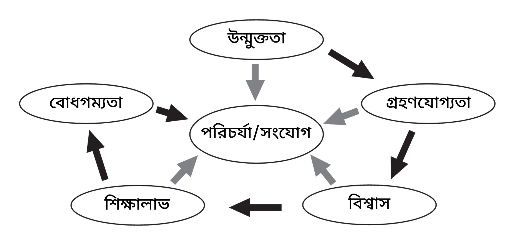 ডুয়ান এলমার (Duane Elmer) লিখেছেন যে অন্যদের কাছে পরিচর্যা কাজের জন্য বোধগম্যতা, শিক্ষালাভ, বিশ্বাস, গ্রহণযোগ্যতা, এবং ঊন্মুক্ততা প্রয়োজন। ড. এলমার এই মডেলটি বিবিধ-সাংস্কৃতিক পরিচর্যার জন্য ব্যবহার করেছিলেন। এটি বিবিধ-সাংস্কৃতিক সংযোগ স্থাপনের জন্য গুরুত্বপূর্ণ।[1]