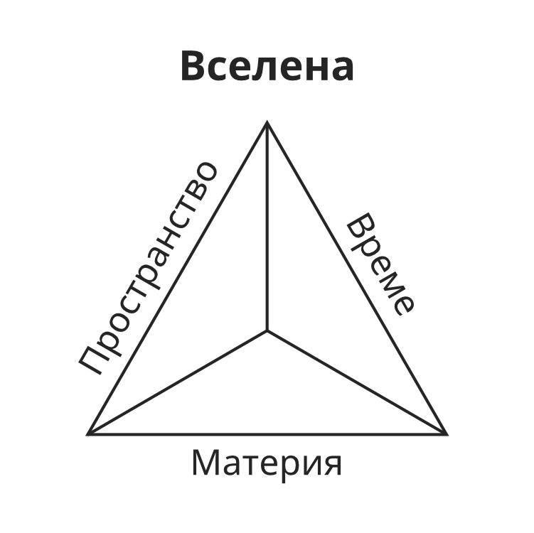 Когато обаче наблюдаваме вселената, виждаме друг пример за три в едно. Вселената има три аспекта – пространство, време и материя. Тя не може да съществува, ако някое от тези три липсва.
