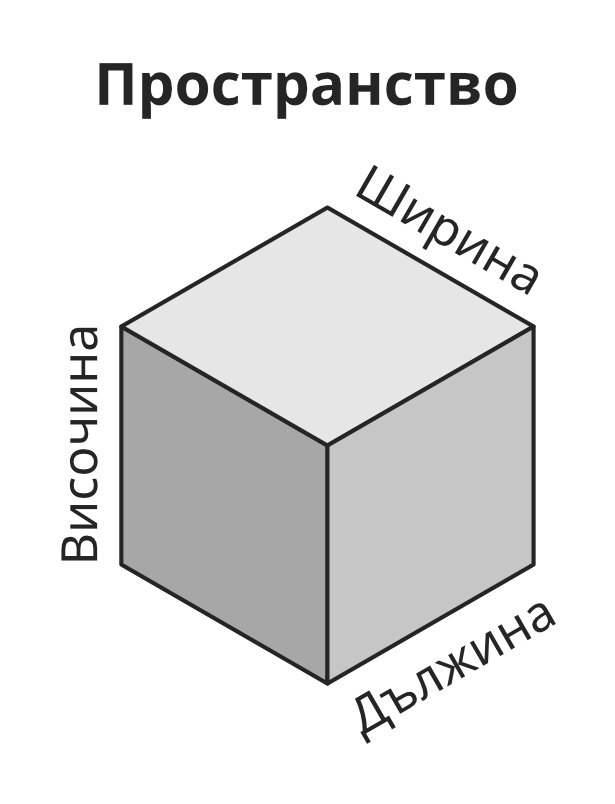 Пространството има дължина, ширина и височина – три в едно. Не може да съществува пространство без някое от тези измерения.
