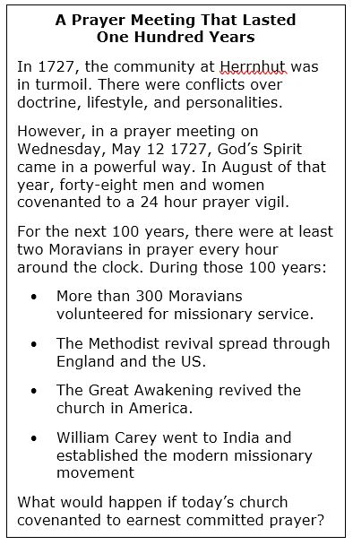 The Moravians put great emphasis on prayer. On May 12, 1727 the Moravians experienced an outpouring of the Holy Spirit during a Wednesday prayer meeting. In August, they began a twenty-four hour prayer vigil that continued for more than one hundred years. Within six months after this, twenty-six young Moravians had volunteered for missionary service – in a time when foreign missions were almost unknown among Protestants.
