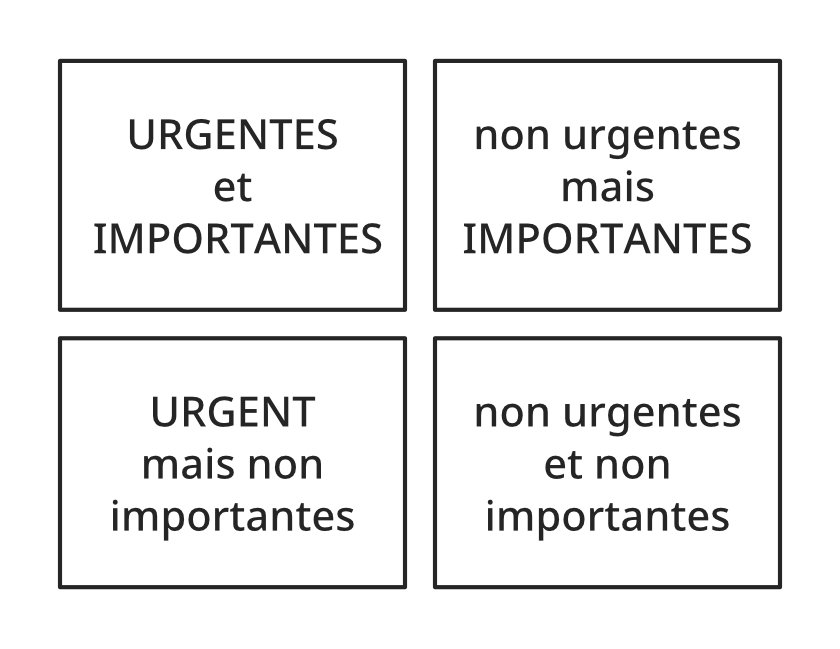 ► Que chaque étudiant dresse une liste de toutes les activités qu’il réalise dans le cadre de ses responsabilités, puis, comme le graphique de la page précédente, qu’il dessine quatre carrés afin d’y noter les activités figurant sur la liste. Puis le moniteur demandera à la classe : Identifiez les activités importantes mais non urgentes que vous avez négligées ? Perdez-vous du temps avec celles qui ne sont ni importantes et ni urgentes?