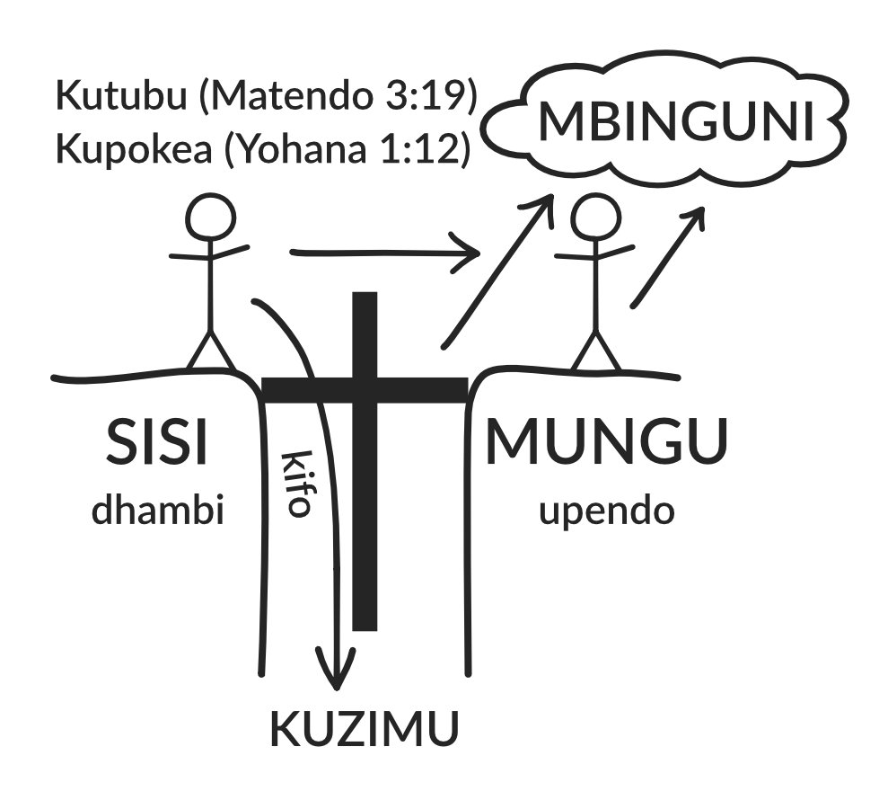 Sasa kama tutatubu – kama tutageuka kabisa katika dhambi zetu (Matendo 3:19) – na kama tutampokea Kristo katika mioyo na maisha yetu – tukimwamini yeye atatusamehe sisi (Yohana 1:12) – ndipo mara moja tunatoka mautini kuingia uzimani, (tutakuwa tumelivuka daraja). Tutaingia kwenye uhusiano na Mungu, na kufanyika kuwa uzao mpya. Mwisho wa yote, wale wote wanaomwamini Kristo pekee yake kwa ukombozi wake wataingia mbinguni kwa ajili ya kuishi kwenye maisha ya umilele ya ushirika wa furaha na Mungu pamoja na wale wote watakaokuwa wanamjua Mungu kwa usahihi.