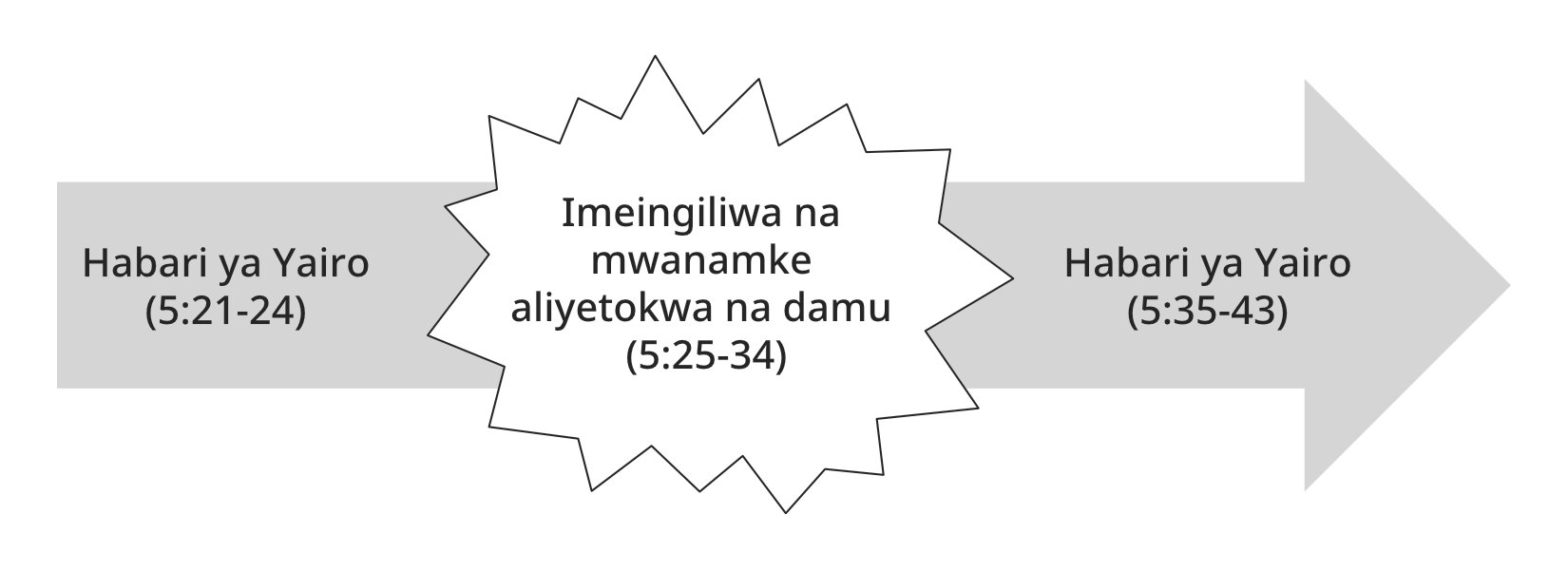 Soma Marko 5:21-43. Ni habari moja ambayo ina miujiza miwili. Habari ya mwanamke aliyetokwa damu inaingilia kati habari ya Yairo na binti yake. Ni nini ulinganifu na ukinzani kati ya habari hizi mbili? Muundo unaonekana kama hivi: