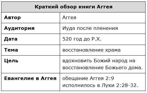 Аггей начал проповедовать осенью 520 года до Р.Х. Он провозгласил серию из четырех проповедей, связанных с храмом. Из-за сложностей жизни в Иерусалиме люди потеряли рвение к восстановлению храма. Примерно две декады спустя после возвращения Зоровавеля храм был все еще в руинах. Аггей был Божьим посланником от имени Божьего дома.
