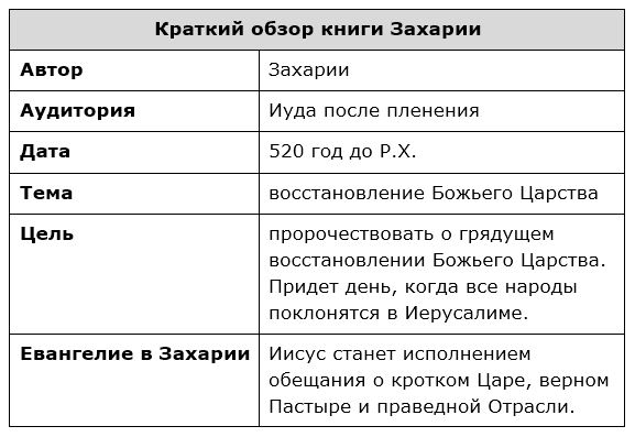 Захария был из семьи священников, которая вернулась в Иуду с Зоровавелем[1]. Как и Аггей, Захария был «храмовым пророком». Его первая весть прозвучала спустя два месяца после послания, провозглашенного Аггеем. Вместе с акцентом на храме Захария показывает, что Бог восстановит Свое Царство и сегодня, и в будущем.