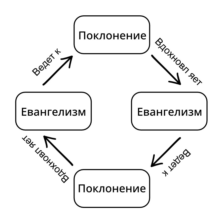Поклонение вдохновляет церковь на благовестие. По мере того, как община направляет неверующих ко Христу, уверовавшие становятся поклонниками, а затем эти новые поклонники получают вдохновение к евангелизму.