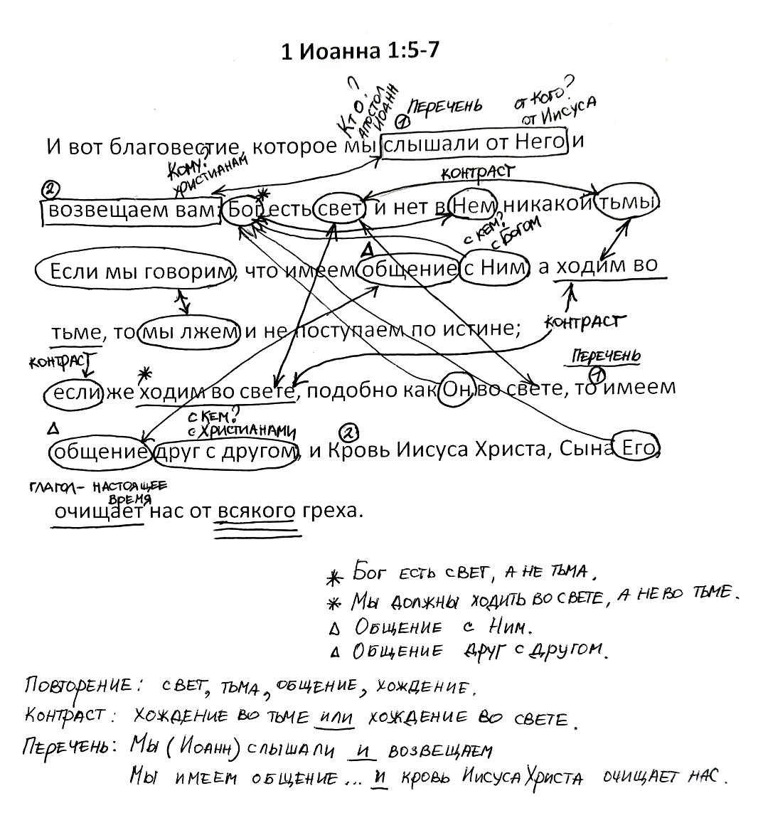 В 1 Иоанна 1:5-7 демонстрируется контраст между тьмою и светом двумя способами: