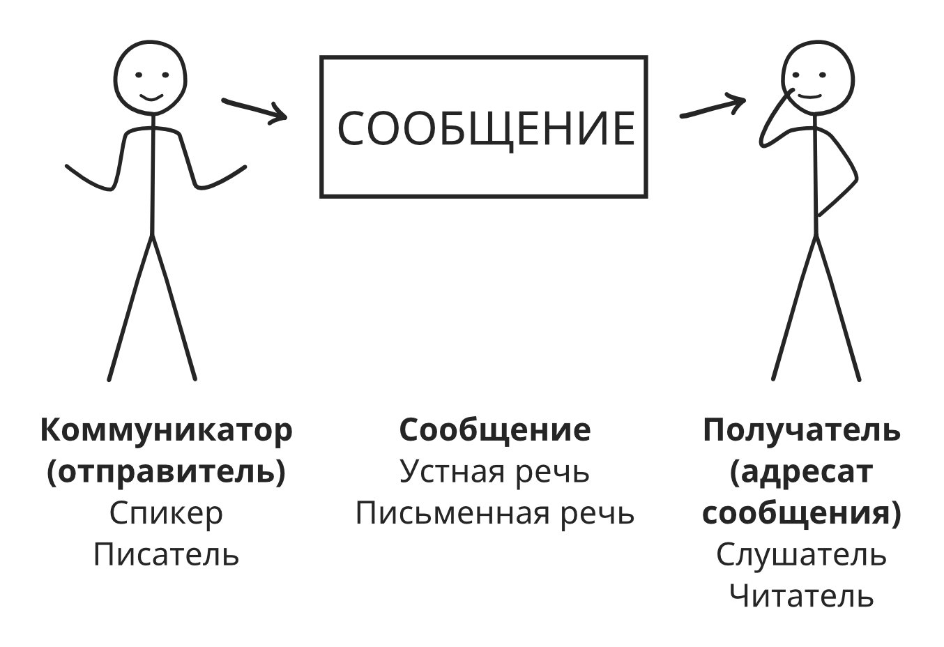 Общение слагается из трех компонентов: того, кто передает информацию (Коммуникатор), того, кто получает информацию (Принимающий), и вести. Человек, транслирующий информацию, передает весть, которую другой человек получает.