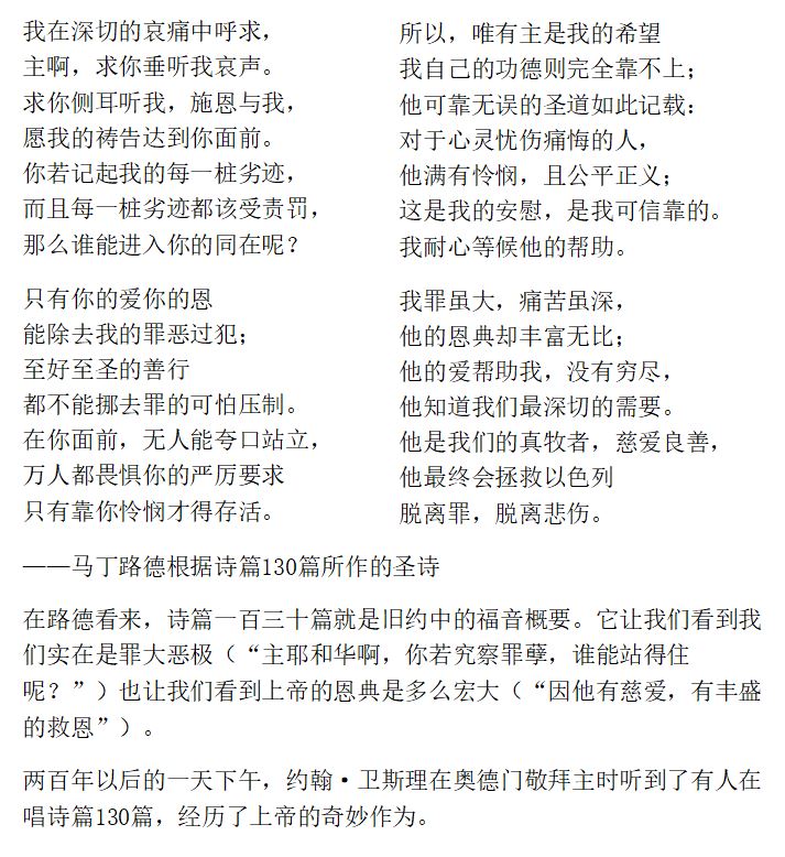 他的幻想破灭了,于是开始探寻,“罪人怎样才能在圣洁的上帝面前蒙悦纳?”他在罗马书中读到:“因为上帝的义正在这福音上显明出来,这义是本于信,以至于信,如经上所记:‘义人必因信得生。’”[2] 他在这节经文中找到了令人惊异的真理,那就是“上帝完全是凭着他的恩典和怜悯通过我们的信心使我们称义。”路德由此明白“上帝的义”并不只是上帝的要求,也是上帝的预备。