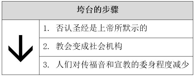 接受这些理论的牧师不再把圣经看成是由上帝所默示的、毫无谬误的上帝之道,他们手中的圣经是由可犯错的人写出的有谬误的一本书。最后,这些在自由派神学院受训的牧师在许多教会把这些错误思想传播给普通信徒。