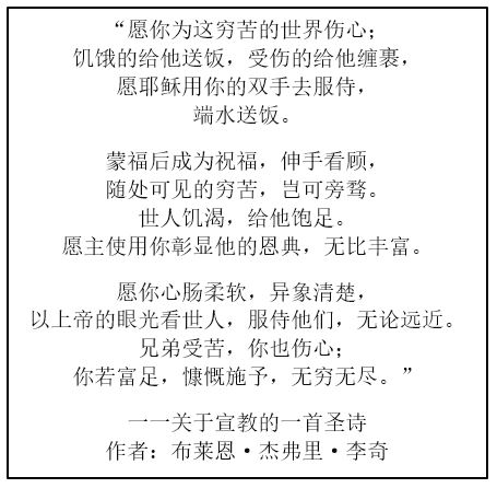 我们在学习教会历史的时候,看到上帝通过热心宣教的人来工作。我们在第5课读到布斯看到的失丧者得救的异象;“灵魂!灵魂!我的心渴想看到灵魂得救。”在漫长的教会历史上,上帝曾使用无数的男男女女来扭转历史进程。我们在这些为上帝所重用的人身上也看到这一份热心。有无数的男男女女有心像上帝爱世人那样来爱人,上帝就通过他们来工作。从一世纪到印度宣教的使徒多马到二十世纪投身于圣经翻译的卡梅伦·汤森,上帝一直在使用热心赢得人心归主的人来工作。