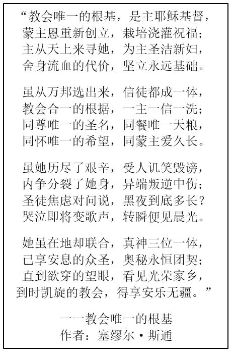 “我不但为这些人祈求,也为那些因他们的话信我的人祈求,使他们都合而为一;正如你父在我里面,我在你里面,使他们也在我们里面,教世人可以信你差了我来。”[2]
