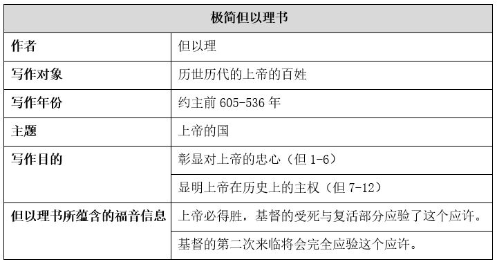 1–6章记载了上帝保护但以理的史实,7–12章记载了但以理所见的异象,但以理书通过这些史实和异象显明了上帝不但对耶路撒冷拥有主权,也对全世界拥有主权。对于被掳异邦的人来说,这个信息太有力了。但以理书一开篇即见证说上帝凭他的主权把犹大交予尼布甲尼撒,后又记载那亘古常在者给出的异象,那亘古常在者要为他的百姓建立永恒的国度,但以理通过这一切表明上帝掌管着人类历史。
