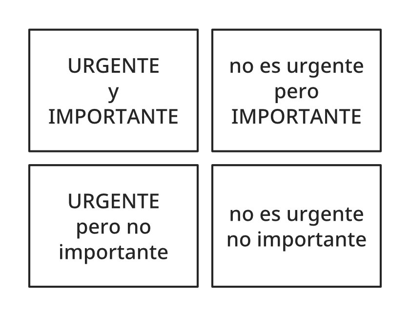 ► Cada alumno debe hacer una lista de todas sus actividades y responsabilidades. A continuación, dibuje cuatro recuadros como los del cuadro anterior y reparta las actividades en los recuadros. Reflexiona: ¿Qué cosas estás descuidando que son importantes, pero no urgentes? ¿Pierdes el tiempo en cosas que no son importantes ni urgentes?