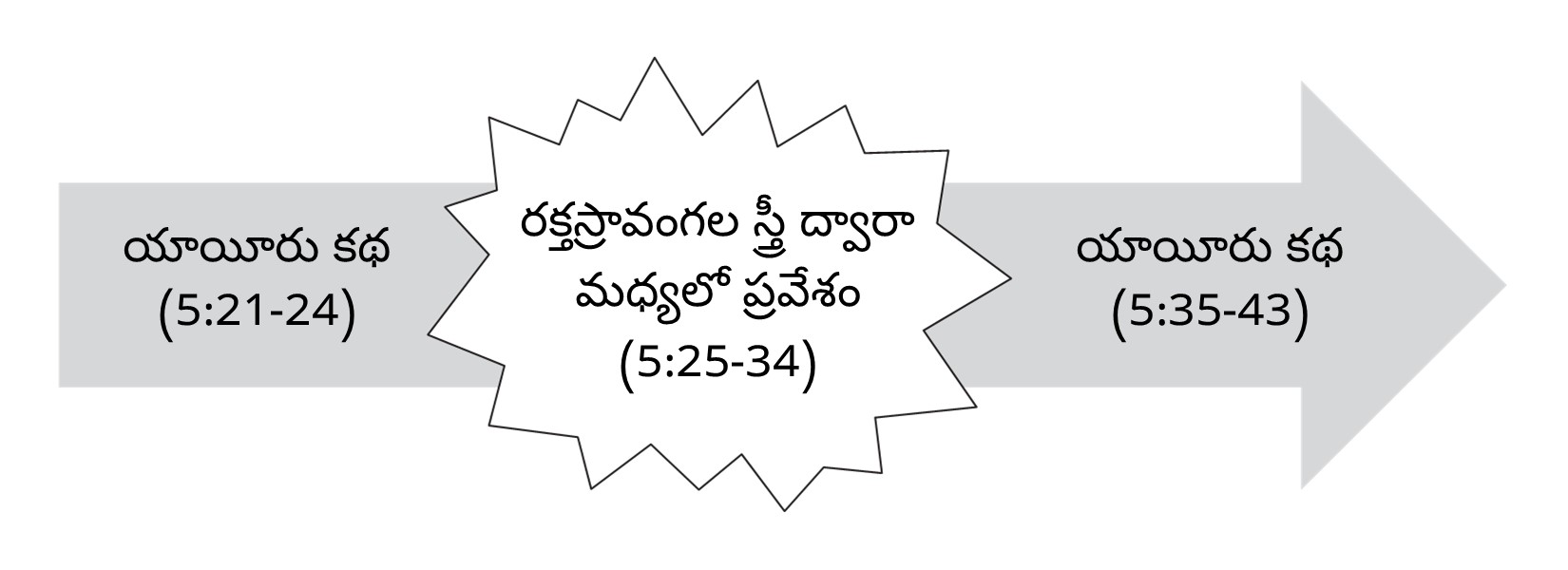 మార్కు 5:21-43 చదవండి. ఇక్కడ ఒక కథలో రెండు అద్భుతాలు ఉన్నాయి. యాయీరు, తన కుమార్తె కథ మధ్యలో రక్తస్రావంగల స్త్రీ కథ మధ్యలో ప్రవేశిస్తుంది. ఈ రెండు కథల మధ్య పోలికలు, వ్యత్యాసాలు ఏంటి? ఆకృతి ఇలా ఉంది: