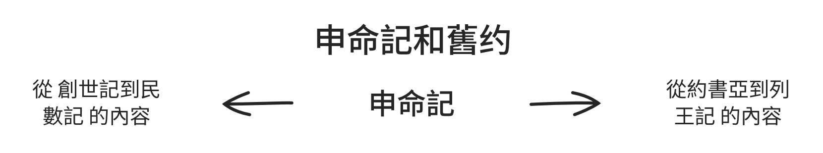 申命記這卷書的書名原為「第二律法」的意思。這「第二律法」也不是新的律法,而是向新一代以色列人重申聖約。以色列儘管在曠野不忠心,但上帝並未忘記祂的子民。而申命記就表明上帝與亞伯拉罕和摩西所立的約仍有效。