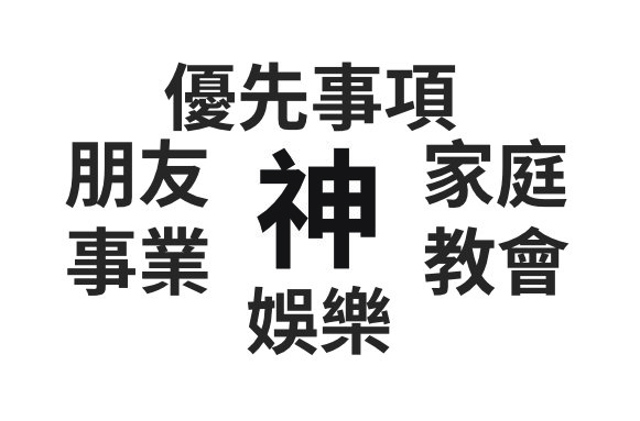 許多人敬拜金錢、工作、地位、人際關係或快樂。這些事情在他們的生活中是最重要的。你怎麼知道你敬拜什麼?看看你的生活。什麼能獲得最多的精力、時間和金錢?這就是你認為對你最有價值的東西;這就是你所敬拜的。[2]