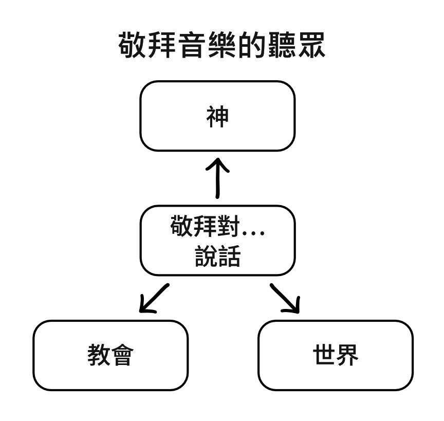 當我們忘記其中一類聽眾時,我們的敬拜就不能達到神給教會的全部目的。當我們忘記神是我們敬拜的最終受眾時,我們的敬拜就不是主要向神說話了。當我們忘記教會也是敬拜的受眾時,我們就不能在敬拜中彼此教導、彼此警戒。當我們忘記敬拜應該向世界宣講福音時,我們就不能傳福音,不能完成大使命。