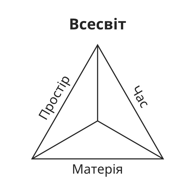 Однак, якщо ми подивимося на структуру Всесвіту, то побачимо ще один приклад єдності трьох. Всесвіту притаманні три аспекти — простір, час і матерія; у відсутності будь-якого з цих елементів Всесвіт не зміг би існувати.